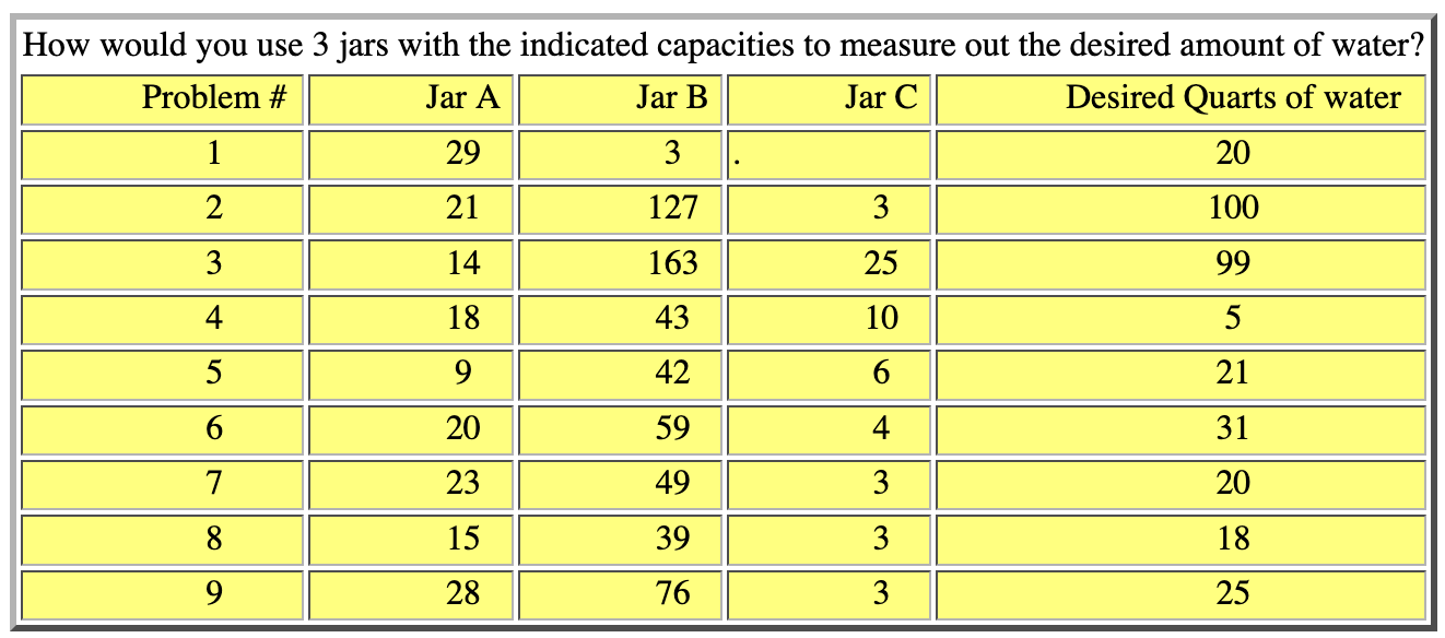In 1942, two scientists, Abraham and Edith Luchins, published the findings of an experiment conducted with jars of water. In the experiment, participants were given nine problems utilizing multiple sized jars of water and asked to combine them together to achieve an outcome. The results of the experiment revealed a remarkable truth about the way human beings solve problems.